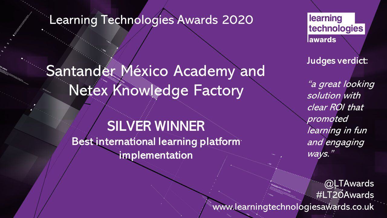 learningCloud de Netex Learning fue implementado a su máximo potencial por nuestro cliente Banco Santander México «de manera excepcional”, y a los jueces les encantó “esta solución tan atractiva». Según el jurado del premio, «hubo un claro retorno de la inversión en el negocio», y también destacaron que «el departamento de Formación promueva el aprendizaje de forma divertida y atractiva». Un brillante ejemplo de la importante diferencia que la plataforma adecuada puede hacer en una organización y su impacto en los empleados y en su rendimiento.
