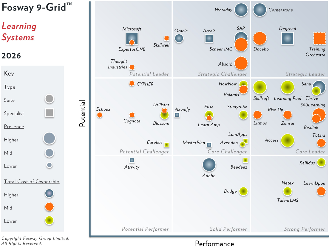 La compañía forma parte además del reducido grupo de proveedores que aparece simultáneamente en dos de los principales análisis de Fosway Group, al figurar también como Core Leader en el Fosway 9-Grid™ for Digital Learning.